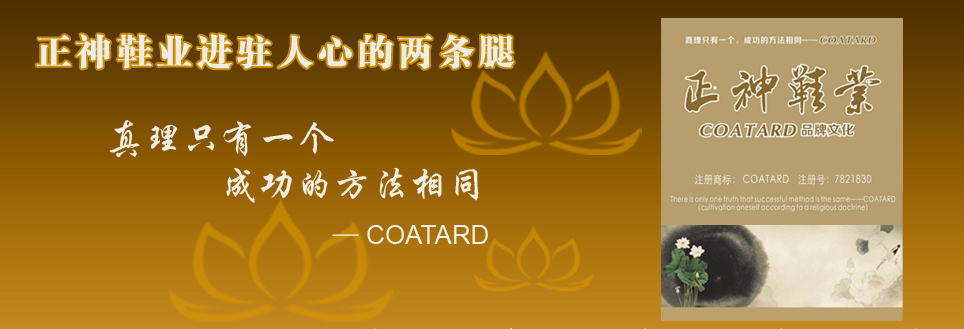 正神鞋業(yè)之所以不因自身鄙微而憂(yōu)懼,一是因?yàn)镃OATARD(修行)品牌承載了佛道儒三家文化三千年來(lái)永傳不變的人生成功之法則。二是因?yàn)楫?dāng)今充滿(mǎn)創(chuàng)造力的時(shí)代已經(jīng)觸動(dòng)了廣大的靈魂和覺(jué)者尋求自身生命也同樣具有的不曾釋放和發(fā)揮的偉大潛力!而正神鞋業(yè)的創(chuàng)立,正是為了把佛道儒三家文化三千年來(lái)永傳不變的人生成功之法則通過(guò)品牌鞋所蘊(yùn)涵的民族文化與尋求自身生命偉大可能性、偉大潛能的釋放和發(fā)揮的生命個(gè)體融匯一體!使我們?cè)谌粘I钆c工作中的人生覺(jué)悟直接與三教文化的中心相交融,從而幫助我們找到蘊(yùn)涵在自身人生旅程中的真理,去成就自己獨(dú)一無(wú)二的偉大人生和事業(yè)!